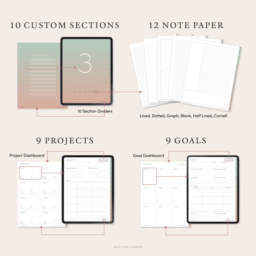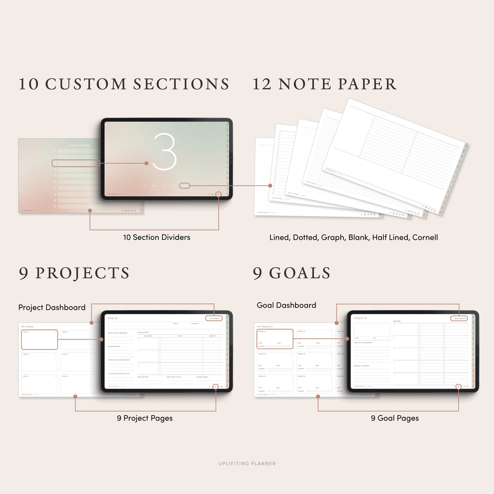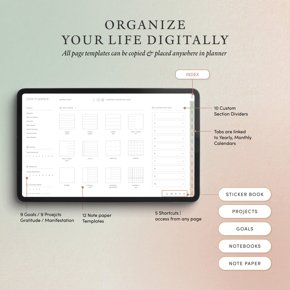 Includes fully hyperlinked yearly, monthly pages, a custom notebook, 12 note paper, goal/project sections and free digital stickers and covers.