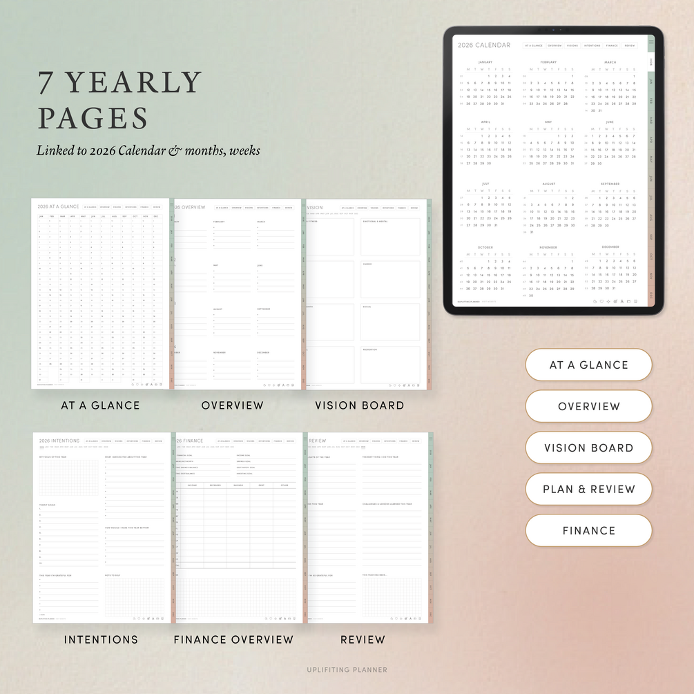 - 12 Monthly Calendars + 12 Monthly Vision Boards + 12 Monthly Check in + 12 Monthly Finance + 12 Monthly Trackers + 6 Yearly pages + 1 yearly Calendar