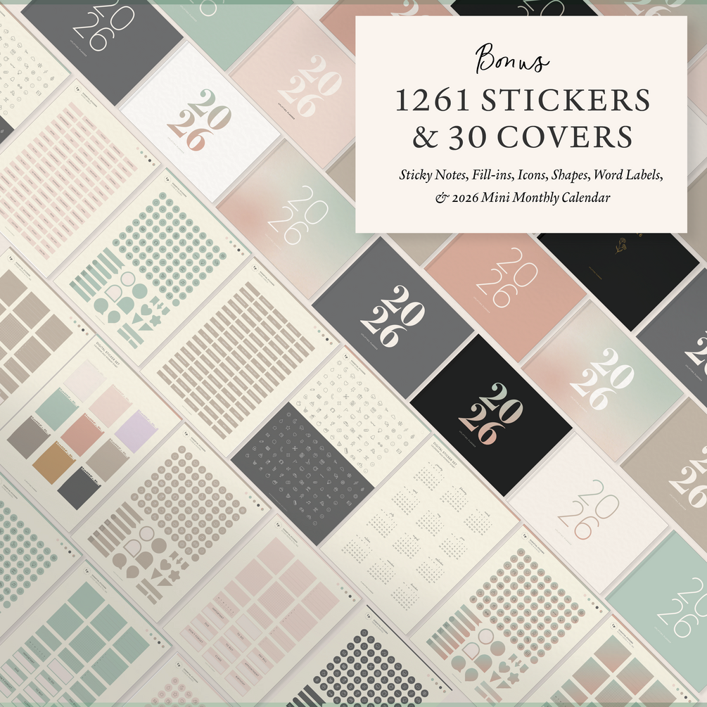• Essential Digital Planner Sticker Pack (5 colors, 1180 Individual PNG Stickers + 1 Goodnotes Sticker book) + 2026 Mini Monthly Calendars